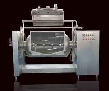 本機的槽型鍋體頂部抽真空,夾套加熱(蒸汽),渦輪減速機傳動(dòng)橫軸攪拌,攪拌器采用聚四氟乙烯漿,刮邊(滾翻物料)攪拌,無(wú)死角,自動(dòng)機械傳動(dòng)卸料,復位。真空炒制可降低炒制溫度,特別使用于熱敏感原料的炒制,避免過(guò)度受熱引起顏色及口味的劣化,保持原料原有的色、香、味。提高炒制效率,降低能耗,縮短炒制時(shí)間。